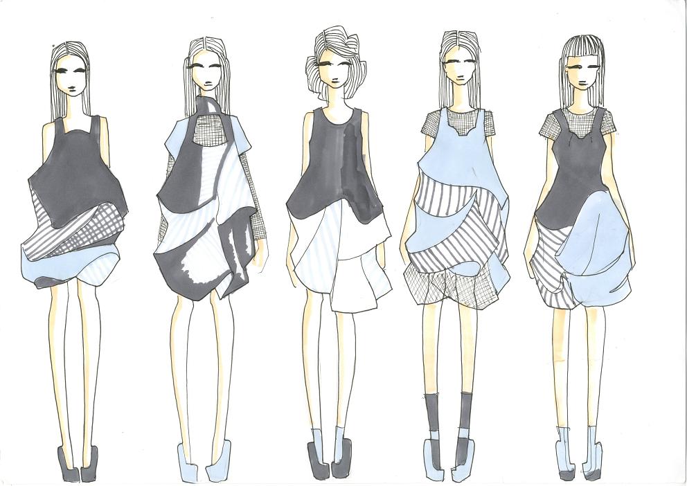 When it came to placing the bodices, it was decided we’d place front bodice slightly near the sewed up edge, and the back bodice slightly out of line from the front. Both patterns were joined together using a spontaneously drawn curve connecting from the bottom of the waist. After this the negative space within the two patterns face each other was cut out.